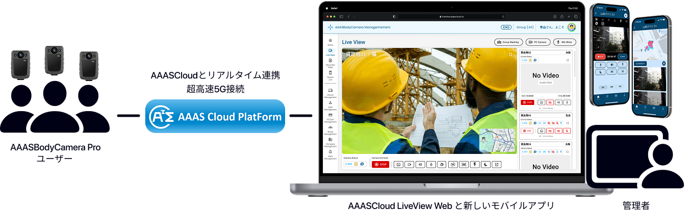 専用プラットフォーム「AAASCloud LiveView」を通じて、AAASBodyCamera Pro各端末と管理者デバイス(お使いのPC)がリアルタイムで連携します。