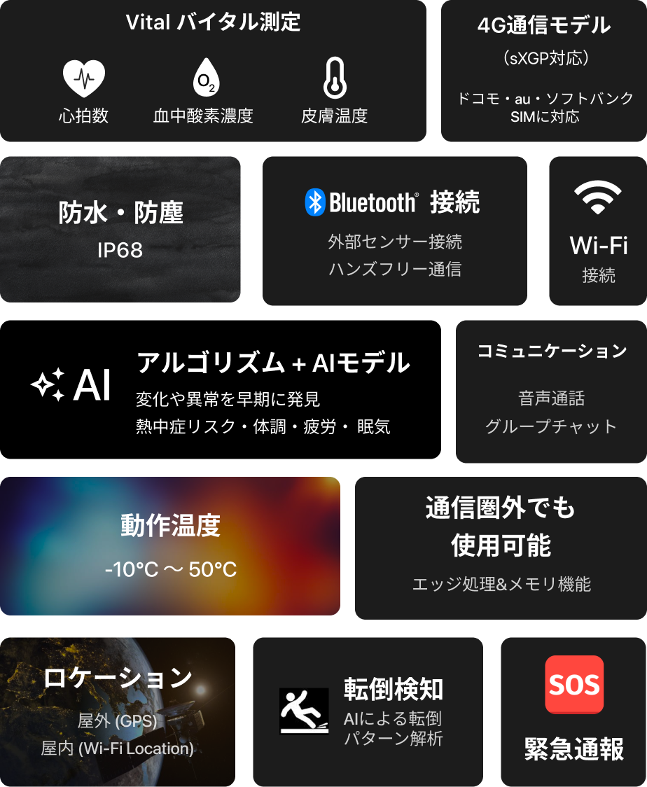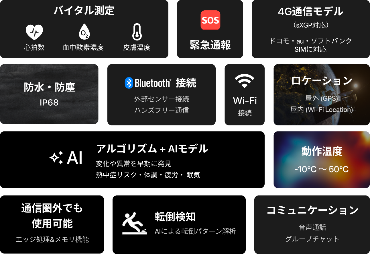 | 見守り機能 | SOS発信 転倒検知 うずくまり(急病)検知 | |